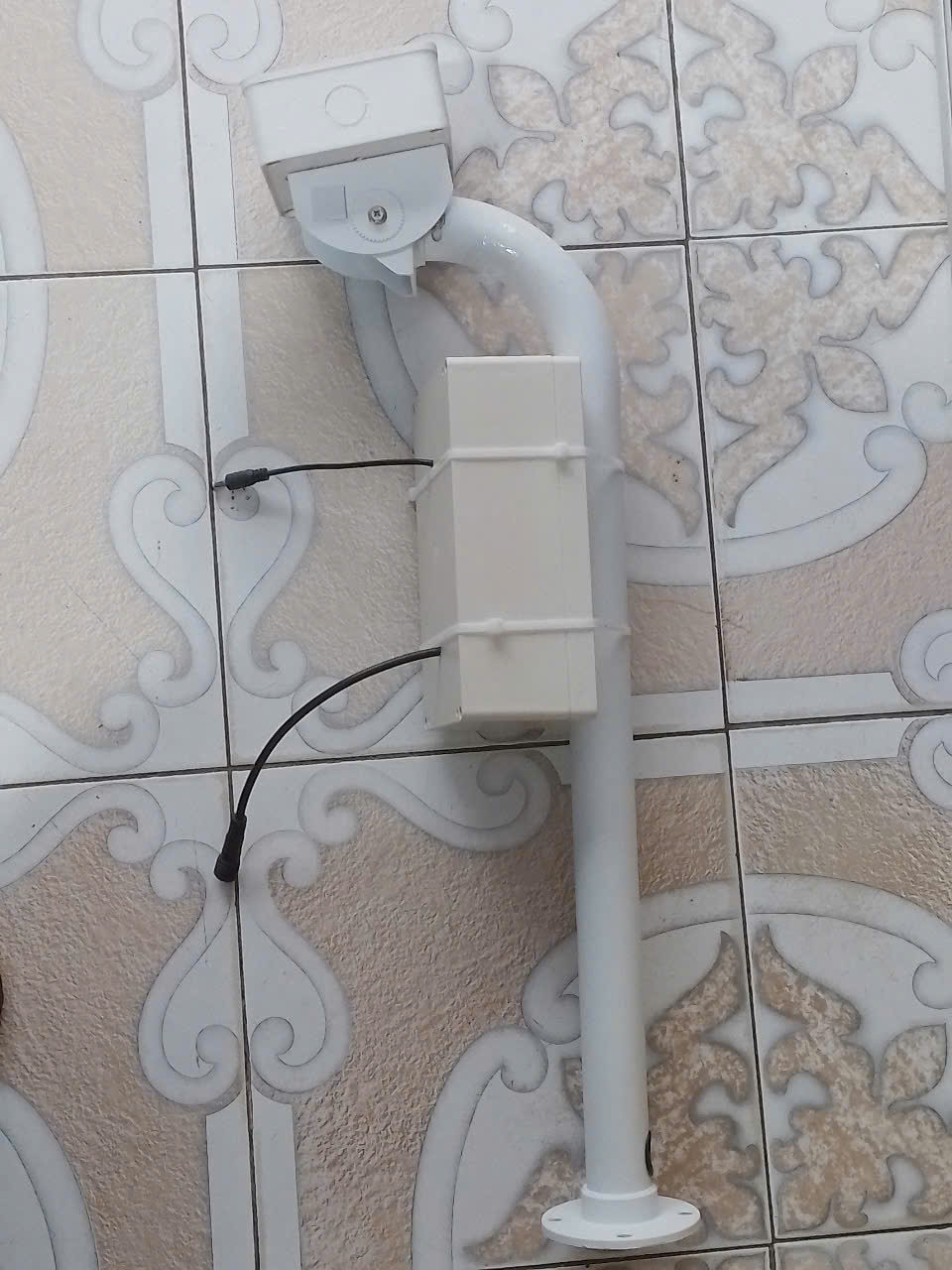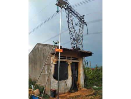 3. Lắp bộ lưu điện lên cán (dùng dây rít hoặc dây kẽm để cố định bộ lưu điện vào cán sao cho 2 dây đầu vào và ra của bộ lưu điện hướng xuống phía dưới) và lắp hộp nhựa kỹ thuật lên đầu cán.